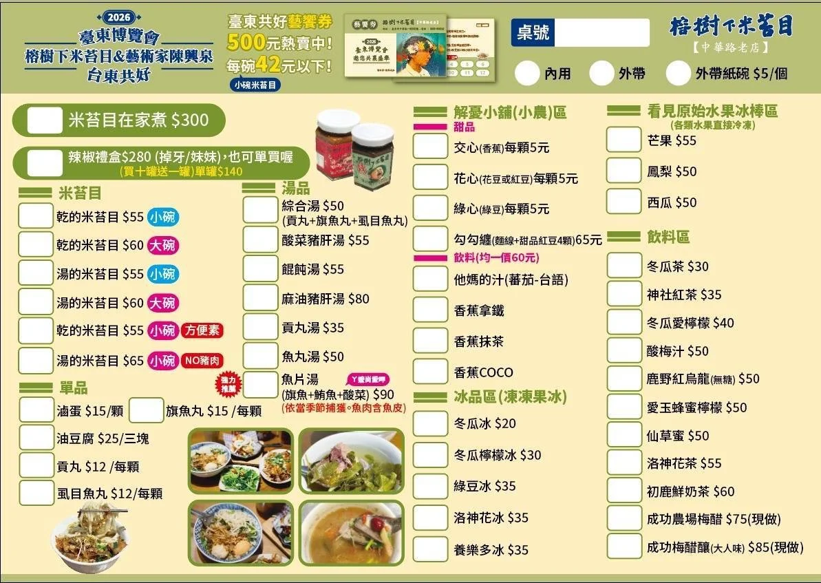 飲料區提供洛神花茶 ($55)、初鹿鮮奶茶 ($60)、冬瓜茶 ($30) 及成功農場梅醋 ($70) 等,全部使用台東在地食材製作。冰品區則有原始水果冰棒(芒果/鳳梨/西瓜)以及古早味洛神花冰、綠豆冰等凍凍果冰,夏天來一碗米苔目配一杯洛神花茶,是最道地的台東味享受。